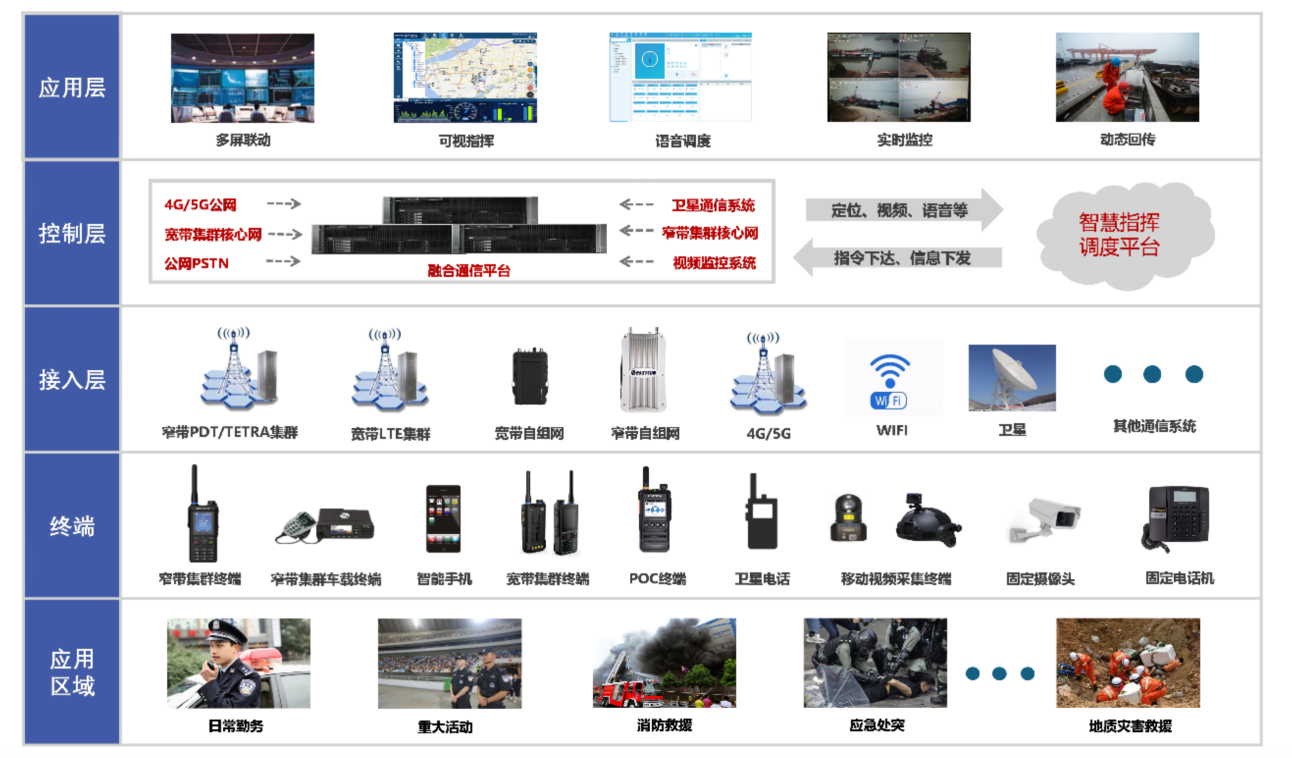 本方案基于5G MCX(关键通信)标准,融合运营商公网与PDT专网资源,打造“专网核心+公网延伸”的立体通信架构。依托5G广覆盖、大带宽优势,弥补PDT在室内与偏远区域的盲区。配备双模终端(支持PDT与5G MCX),实现专公网自动切换,保障通信不中断。